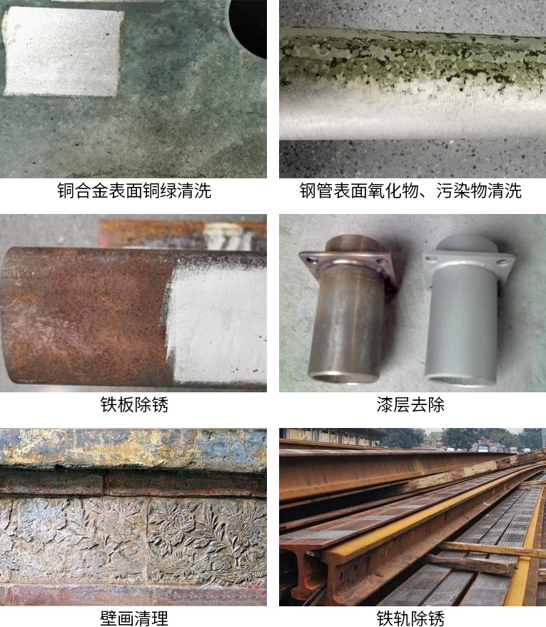 激光清洗具有無研磨、非接觸特點,不但可以用來清洗有機的污染物,也可以用來清洗無機物,包括金屬的銹蝕、金屬微粒、灰塵等,應(yīng)用功效包括:除銹、脫漆、去油污、文物修復(fù)、除膠、去涂層、去鍍層。適用于銹層、漆層較厚,油污較深的情況下清潔,以及表面粗糙化、焊縫清潔等工藝環(huán)節(jié),效率極高。應(yīng)用行業(yè):航空、船舶、文物保護、汽車周邊、食品行業(yè)、軌道、橡膠模具、其他。