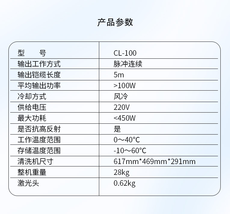 清洗機手持激光頭外觀簡潔、小巧輕便,可以長時間手持使用,按鍵與手柄一體化設(shè)計,簡單易用。內(nèi)置掃描系統(tǒng)采用小型高速電機及驅(qū)動 ,主體為一體化加工成型,堅固防塵且穩(wěn)定耐用。激光頭采用了創(chuàng)新的紅光輔助尋焦設(shè)計,可利用紅光指示輕松找到不同場 鏡下的對焦位置,解決了市場上現(xiàn)有產(chǎn)品對焦不準確以及調(diào)節(jié)方式單一的問題。